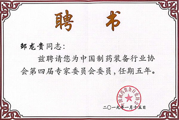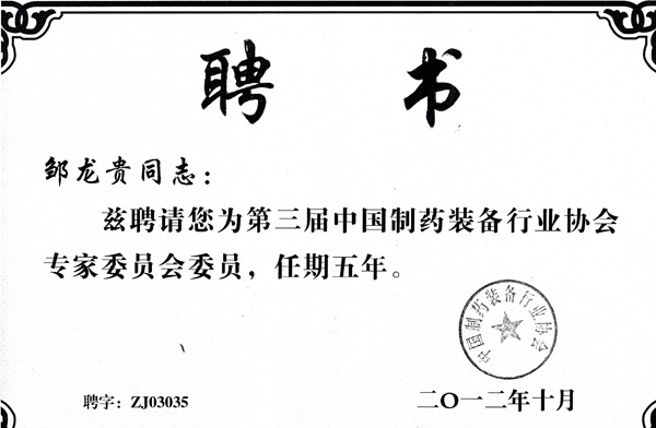 制藥裝備協(xié)會(huì)專家委員聘書