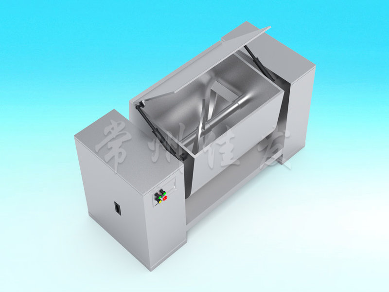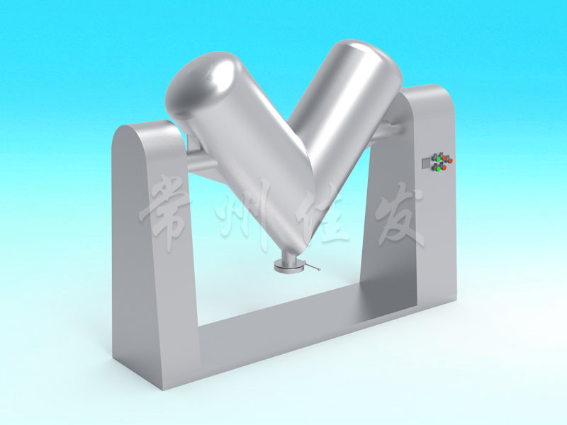该机通过机械传动,使不对称的V型圆柱体内的物料做往复翻动,达到均匀混合之目的。
